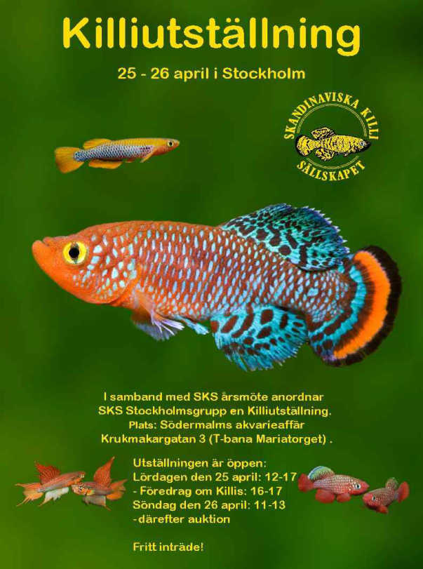 Söndagen den 26 april håller föreningen Skandinaviska killisällskapet en fiskutställning kl 11-13 och sedan auktion kl 13 på Södermalms akvarieaffär, Krukmakargatan 3 i Stockhom. Där kan man hitta många mer ovanliga arter av killifiskar. Vi i Uppsala akvarieförening anordnar samåkning dit på söndagen.
